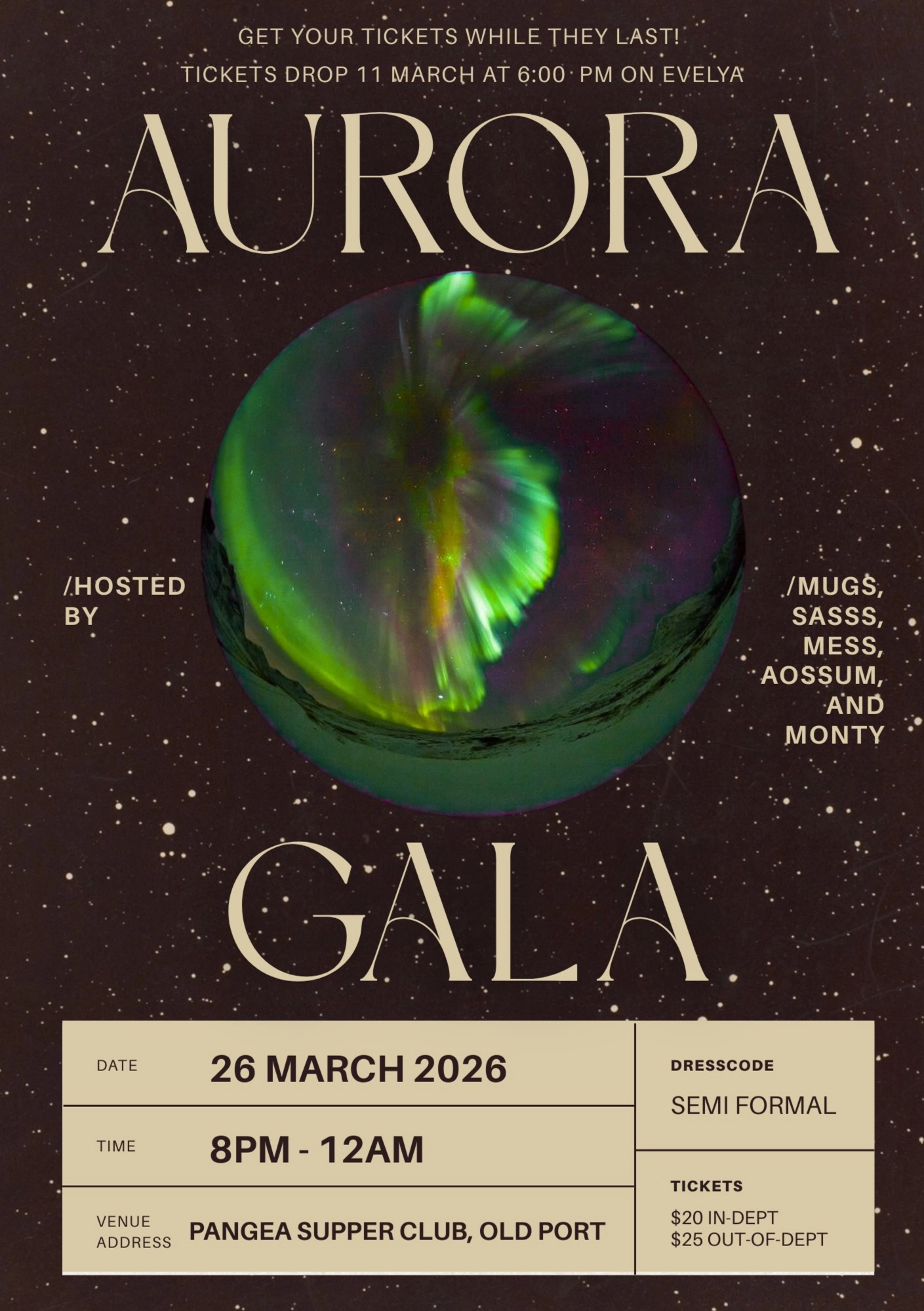 Rejoignez MUGS, SASSS, MESS, AOSSUM et MONTY pour notre collaboration et célébration annuelle de fin d'année… LE GALA AURORA !