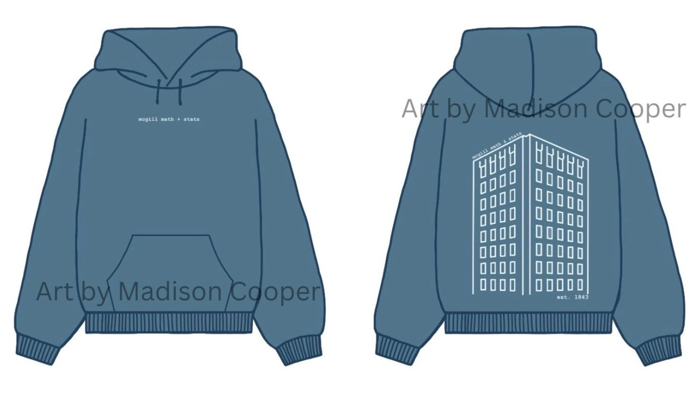 Printed design on front, small. Typewriter font: McGill math + stats. Drawing of Burnside hall on the back with establish date of McGill math.