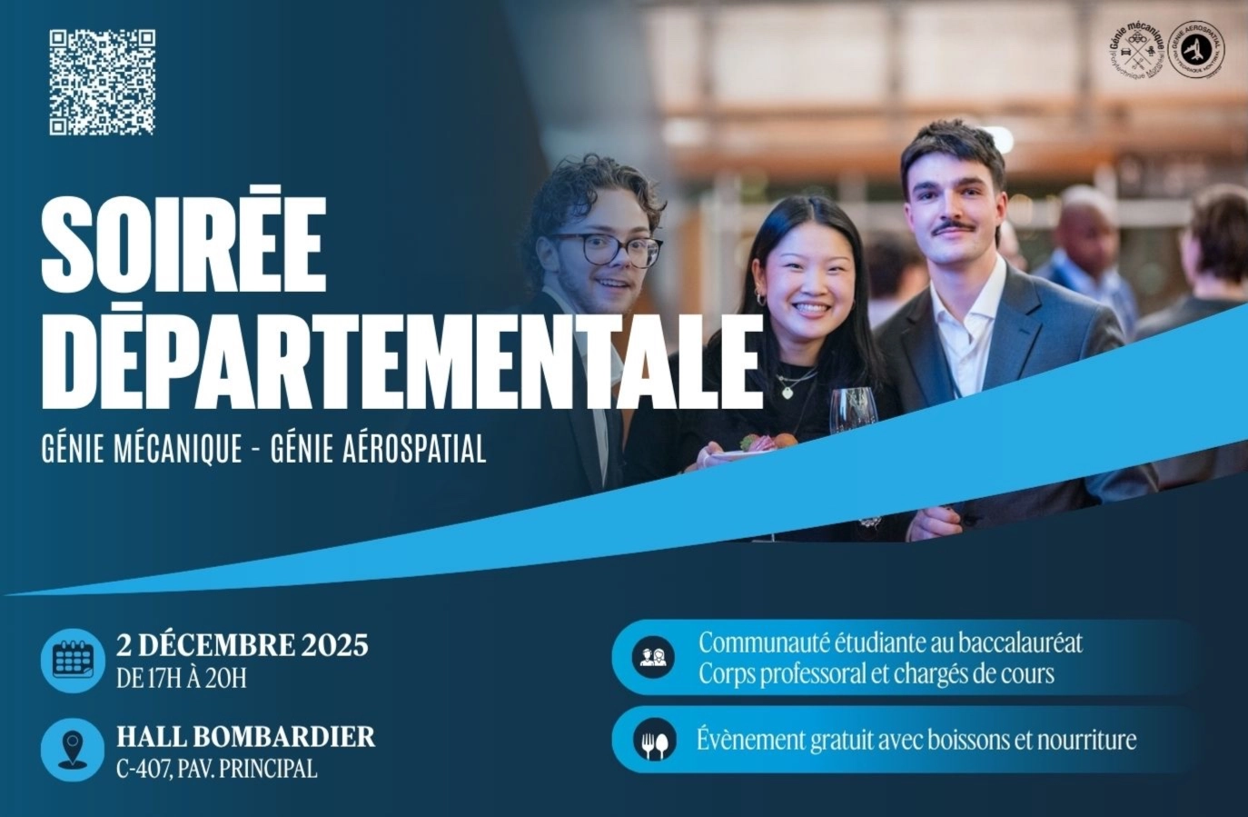 Le département de génie mécanique et de génie aérospatial organise une soirée départementale offerte aux étudiants, au corps professoral et aux chargés de cours. Un moment parfait pour discuter et partager avec vos collègues. Pour les étudiants, c'est l'occasion de poser toutes vos questions, de découvrir de nouvelles opportunités et d'élargir votre réseau professionnel.