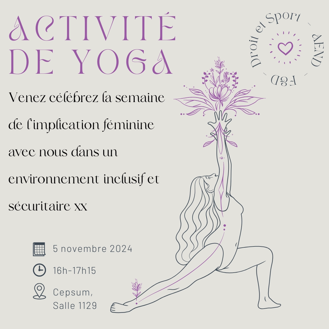 L'AEND ainsi que les comités Droit et Sport et Femmes et Droit vous invitent à une scéance de yoga au Cepsum pour célébrer la semaine de l'implication féminine dans un environnement sains et sécuritaire!