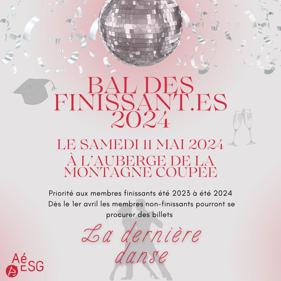 Nous sommes ravis de vous annoncer que la vente de billets pour le bal de fin d'année est maintenant ouverte! Le bal des finissant.es, sous la thématique de La dernière danse, se déroulera le 11 mai 2024. Cette année, nous souhaitons accorder une priorité spéciale à nos finissant.es. Jusqu'au 1er avril, seuls les finissant.es auront l'opportunité d'acheter leurs billets. Après cette date, la vente sera ouverte à tous les membres de l'AéESG.