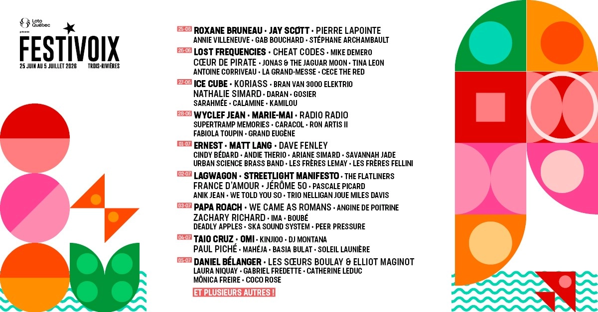 Le FestiVoix est un festival de musique majeur en Mauricie qui lance l’été! En plein cœur du centre-ville de Trois-Rivières, de son quartier historique et aux abords du fleuve Saint-Laurent, plus de 130 spectacles d’artistes internationaux et émergents sont offerts sur 15 scènes pendant 9 jours! Rendez-vous du 25 juin au 5 juillet 2026 pour la 33e édition!💃⚡️