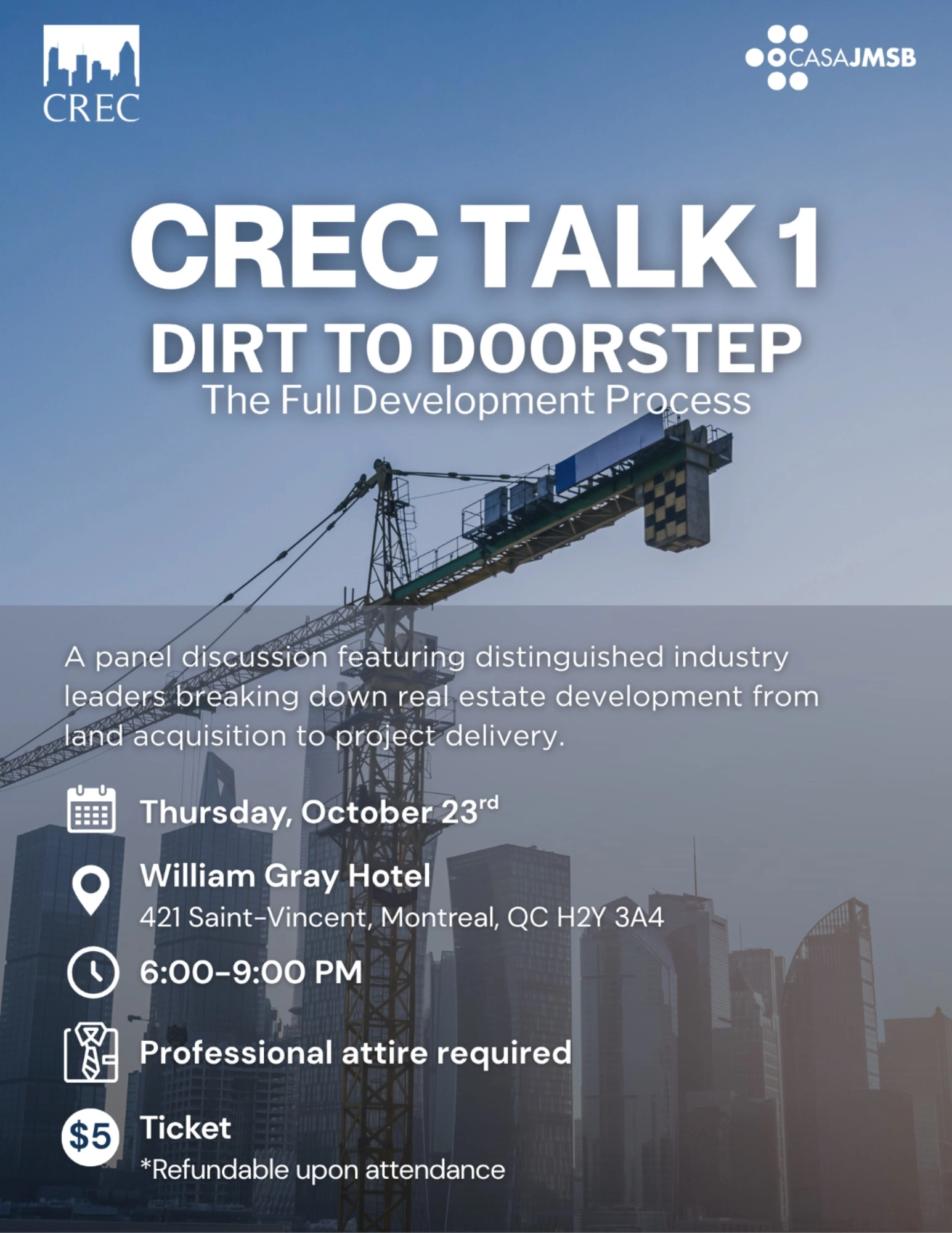 The Concordia Real Estate Club (CREC) is excited to present CREC Talk 1, inviting Concordia undergraduate students to a compelling evening panel on the real estate development process. This event gives students the chance to uncover how a simple piece of land is transformed into homes and thriving businesses through professional expertise and vision.