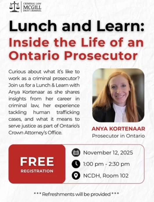 Join us for a Lunch and Learn with Anya Kortenaar, as she shares insights from her journey in criminal law, her work on human trafficking cases, and what it means to serve justice in Ontario's Crown Attorney's Office.
