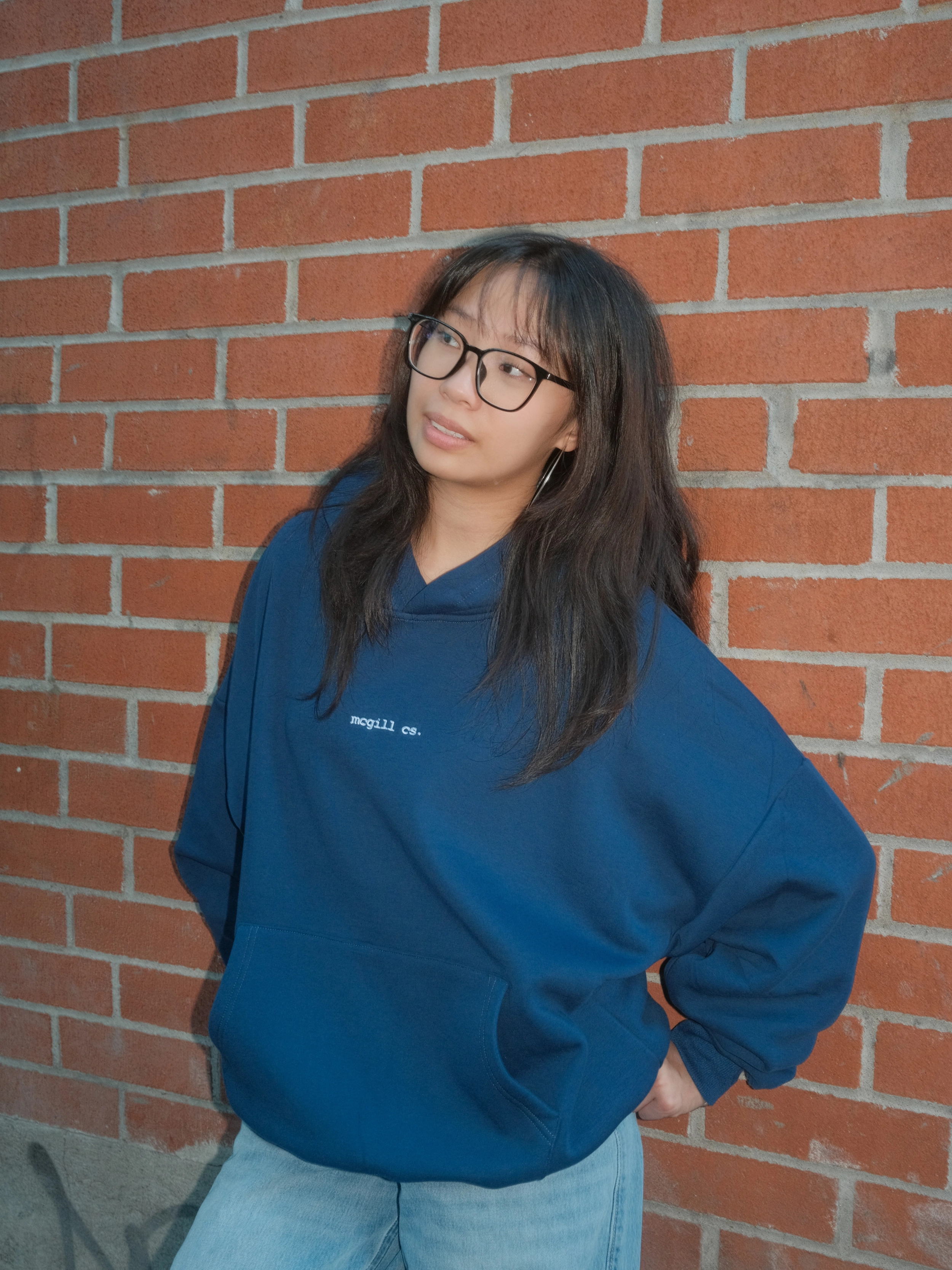 Navy Hoodie with small print "mcgill cs." on the front, there is NO BACK DESIGN.