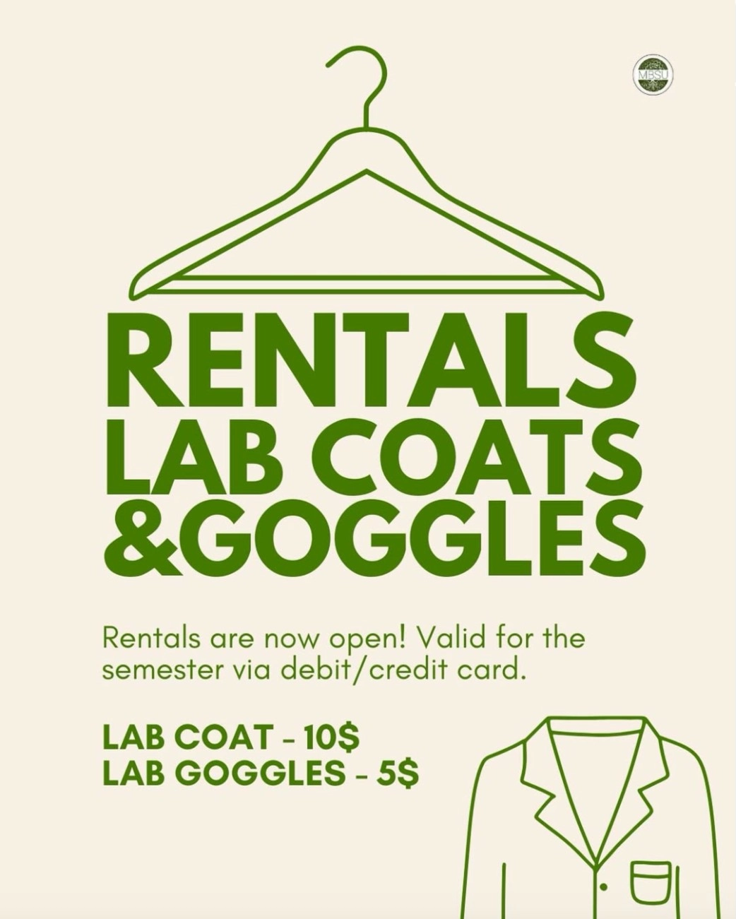 Don’t want to buy a lab coat that you’ll need for only one semester? Want to store your stuff closer to the lab? No worries, because the MBSU is renting out lab coats, goggles, and lockers for winter! 🥼🥽