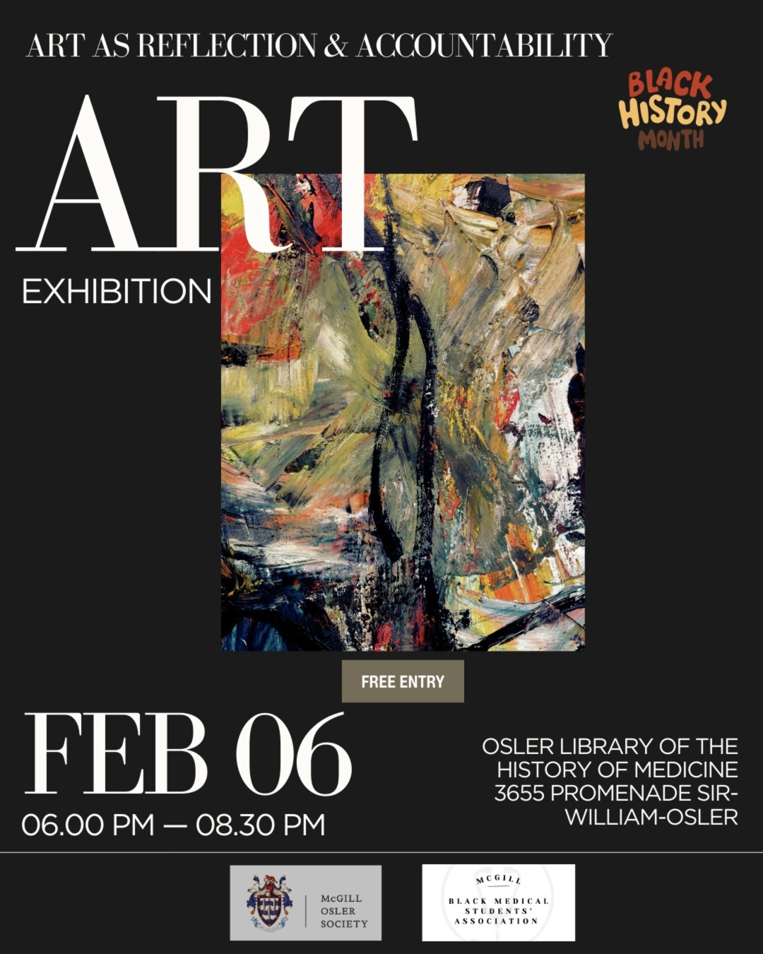 The McGill Osler Society × BMSA McGill are hosting Art for Reflection & Progress, an immersive art exhibition using art and history to reflect on medicine’s past, take accountability, and celebrate progress toward equity. This event explores the intersection of medicine, racialization, and equity through visual storytelling, historical context, and creative expression. The evening will unfold through three chapters: