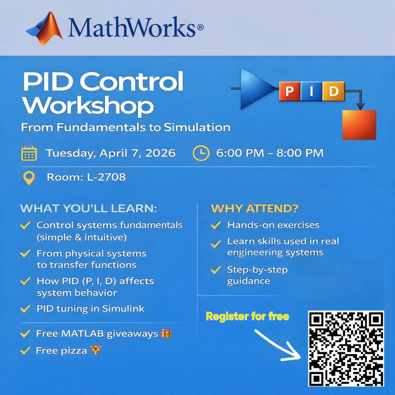 Join our PID Control Workshop: From Fundamentals to Simulation, designed for engineering students who want to understand and apply control concepts in a practical way.