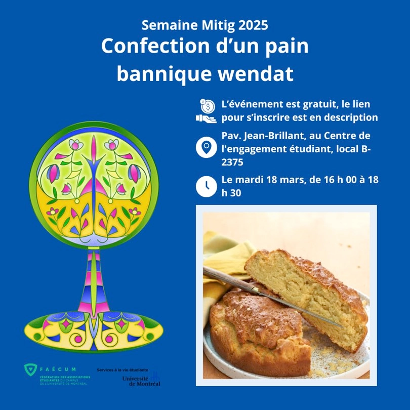 Dans le cadre de l'édition 2025 de la Semaine Mitig, le Comité Droit autochtone de la Faculté de droit de l'Université de Montréal et le Centre de l'engagement étudiant vous invitent à un atelier de cuisine du pain bannique wendat à la manière traditionnelle avec l'artiste et porteuse de savoirs Mélanie Savard.