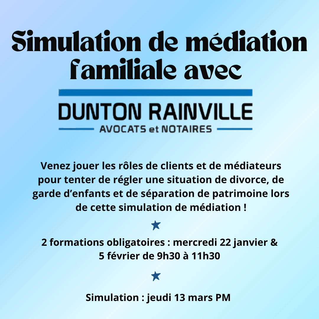 En collaboration avec le cabinet Dunton Rainville, le Comité Droit de la Famille vous offre l’opportunité de participer à une simulation en médiation familiale ! 👨👩👦👦