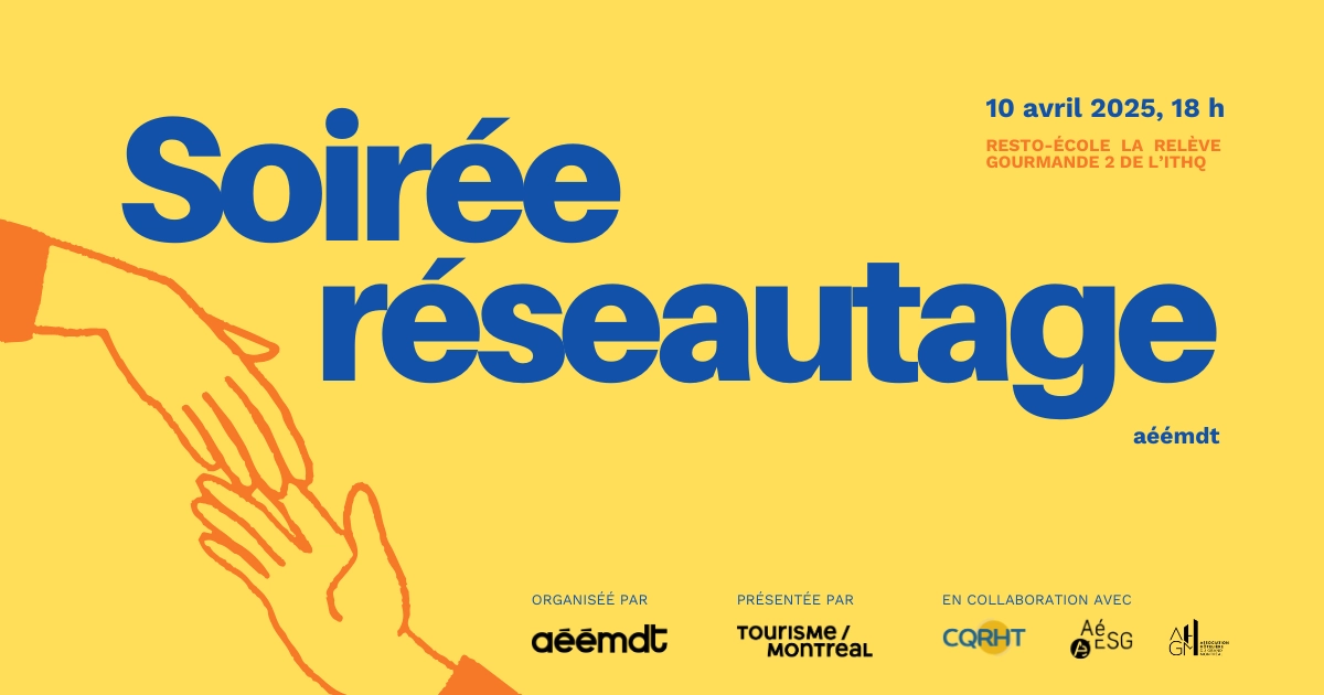 Présentée par Tourisme Montréal et en collaboration avec l’Association hôtelière du Grand Montréal (AHGM) et le Conseil québécois des ressources humaines en Tourisme (CQRHT), cette soirée vise à favoriser les échanges entre la relève et les acteurs du tourisme.