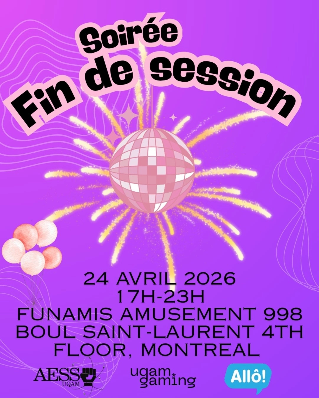 Fête de fin de session organisée en collaboration avec UQAM Gaming, le programme Allo et le comité de jeux de l'AESS !