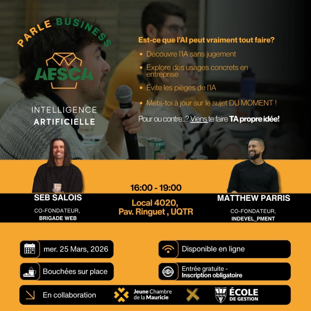 Une collaboration entre l'AESCA, la Jeune Chambre de la Mauricie et l'École de gestion.
