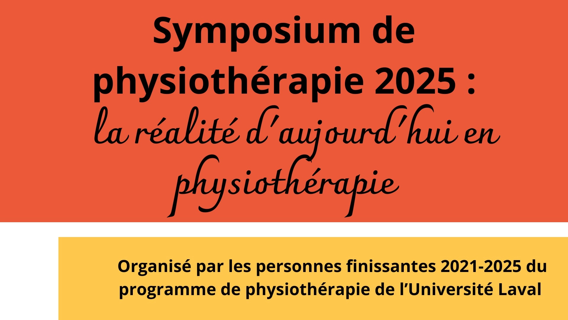 Nous vous invitons à la première édition du Symposium de physiothérapie organisé par les personnes finissantes 2021-2025 du programme de physiothérapie de l’Université Laval qui aura lieu en présentiel, sur le campus de l’Université Laval, le samedi 5 avril 2025.