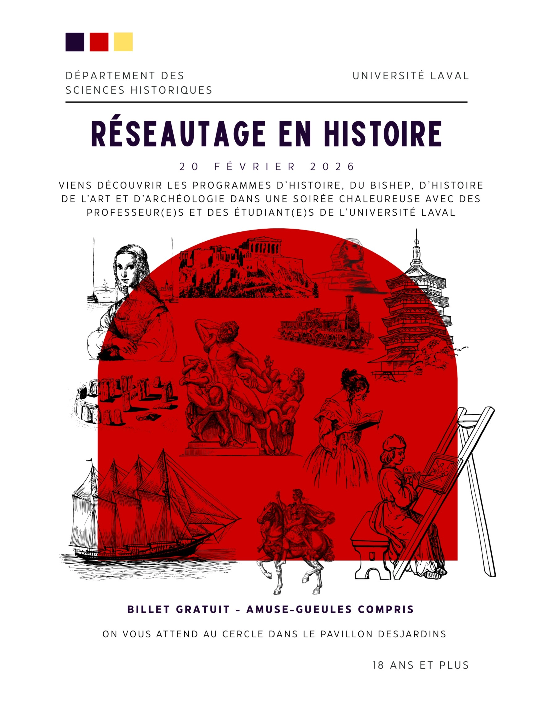 • Formule retenue: Il s'agira d'une formule « 5 à 7 » conviviale où partager et discuter avec des étudiants et étudiantes des différents programmes historiques. Il y aura quelques activités interactives et des bouchées, ainsi que de l'alcool à la vente.