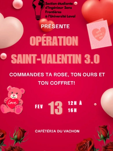 ISF t'offre l'occasion de faire plaisir à tes proches en cette fête de l'amour grâce à son kiosque spécial Saint-valentin . Nous y vendrons des roses ( 5 $), des doudous (15 $) et des coffrets mignons (20 $). Tout est réuni pour t'aider à répandre l'amour autour de toi, alors n'hésite pas