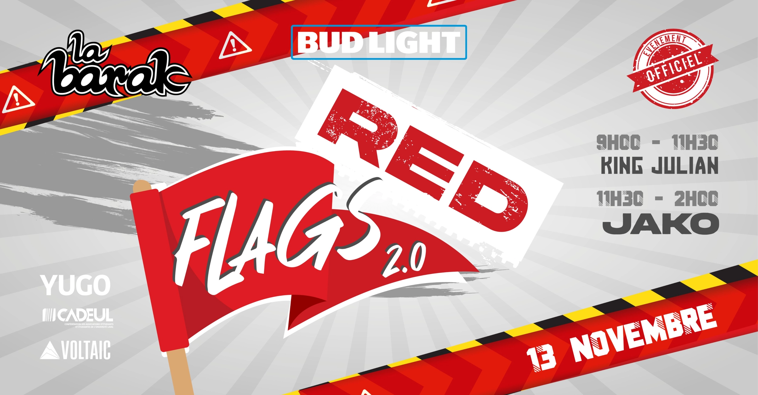 Jeudi le 13 novembre, oublie la dignitĂ© - bienvenue au party Red Flags. Le concept est simple: tu mets un chandail rouge (ou non), tu prends un gros crayon, et tâĂ©cris dessus tout ce qui ferait fuir quelquâun de raisonnable. Parce quâĂ La Barak, on nâĂ©vite pas les red flags, on les imprime sur un chandail PIS ON LES CĂLĂBRE. Pendant cette soirĂ©e complĂštement D-Ă-J-A-N-T-Ă-E tu vas peut-ĂȘtre rencontrer ton Ăąme sĆur ou ton erreur prĂ©fĂ©rĂ©e.